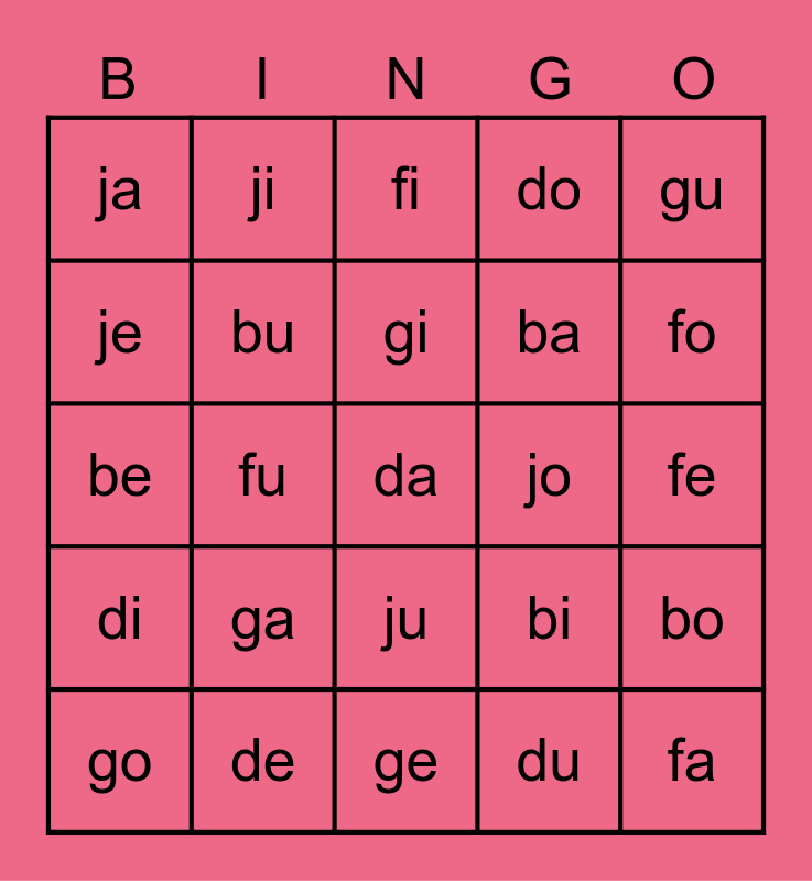 This bingo card has 25 words: ga, ge, gi, go, gu, ja, je, ji, jo, ju, ba, be, bi, bo, bu, fa, fe, fi, fo, fu, da, de, di, do and du.