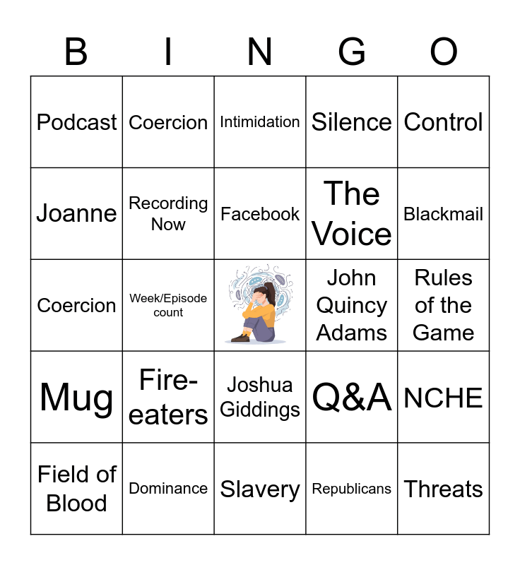 This bingo card has a free space and 43 words: Fear, Threats, Politics, Field of Blood, Guns, Republicans, Intimidation, Power, Control, Dominance, Silence, John Quincy Adams, Joshua Giddings, Fire-eaters, Democracy, Slavery, Democrats, Coercion, Partisan, Blackmail, Coercion, Community, Contingency, Podcast, Links, Rules of the Game, Chat, Bingo, Q&A, Mug, Newbie, NCHE, Annie, Week/Episode count, Poof!, Coffee, Karalee, Facebook, Joanne, The Voice, Partner in Crime, Recording Now and After Party.