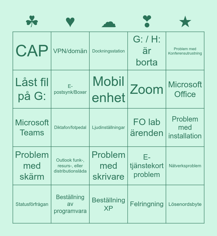 This bingo card has 31 words: Beställning XP, Cosmic support/användarstöd, Diktafon/fotpedal, QR-Kod, CAP, Dockningsstation, E-postsynk/Boxer, E-tjänstekort problem, FO lab ärenden, Felringning, Problem med installation, Ljudinställningar, Lösenordsbyte, MTDC ärende, Microsoft Office, MittVaccin, Nätverksproblem, Outlook funk-, resurs-, eller distributionslåda, Problem med skärm, Problem med skrivare, Problem med Konferensutrustning, Skype, Statusförfrågan, VPN/domän, Zoom, Låst fil på G:, G: / H: är borta, Microsoft Teams, Beställning av programvara, Mobil enhet and Återskapa fil på G:/H:.
