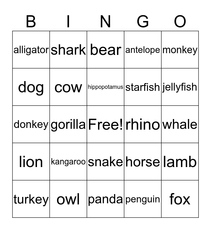 This bingo card has a free space and 50 words: tiger, fox, leopard, panda, kangaroo, cat, shark, deer, dog, giraffe, cow, antelope, lamb, horse, rooster, zebra, hippopotamus, rhino, crocodile, monkey, gorilla, penguin, alligator, starfish, dolphin, seahorse, jellyfish, pig, bear, snake, ant, sheep, hamster, parrot, owl, hen, octopus, goat, rabbit, whale, camel, crab, wolf, elephant, turkey, donkey, bat, goose, lion and duck.