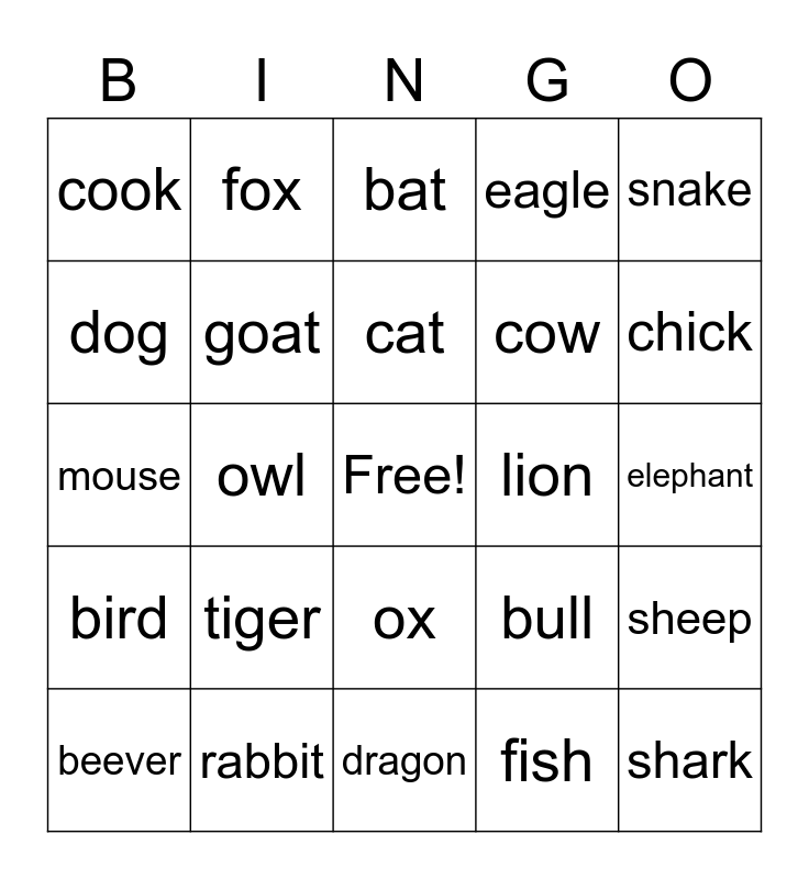 This bingo card has a free space and 24 words: tiger, rabbit, cat, beever, snake, cook, dog, fox, lion, ox, cow, mouse, bull, sheep, goat, fish, elephant, bat, chick, owl, shark, bird, eagle and dragon.