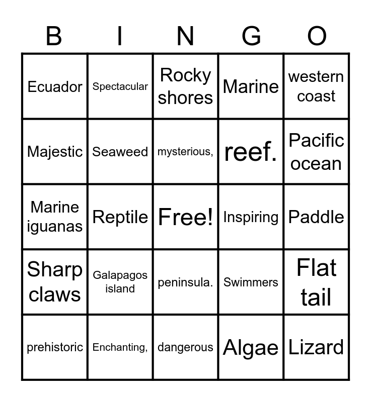 This bingo card has a free space and 24 words: Galapagos island, Enchanting,, mysterious,, prehistoric, western coast, Ecuador, Majestic, Spectacular, Inspiring, peninsula., reef., Marine iguanas, Swimmers, Flat tail, Seaweed, Algae, Paddle, Rocky shores, Pacific ocean, Reptile, Lizard, Sharp claws, Marine and dangerous.