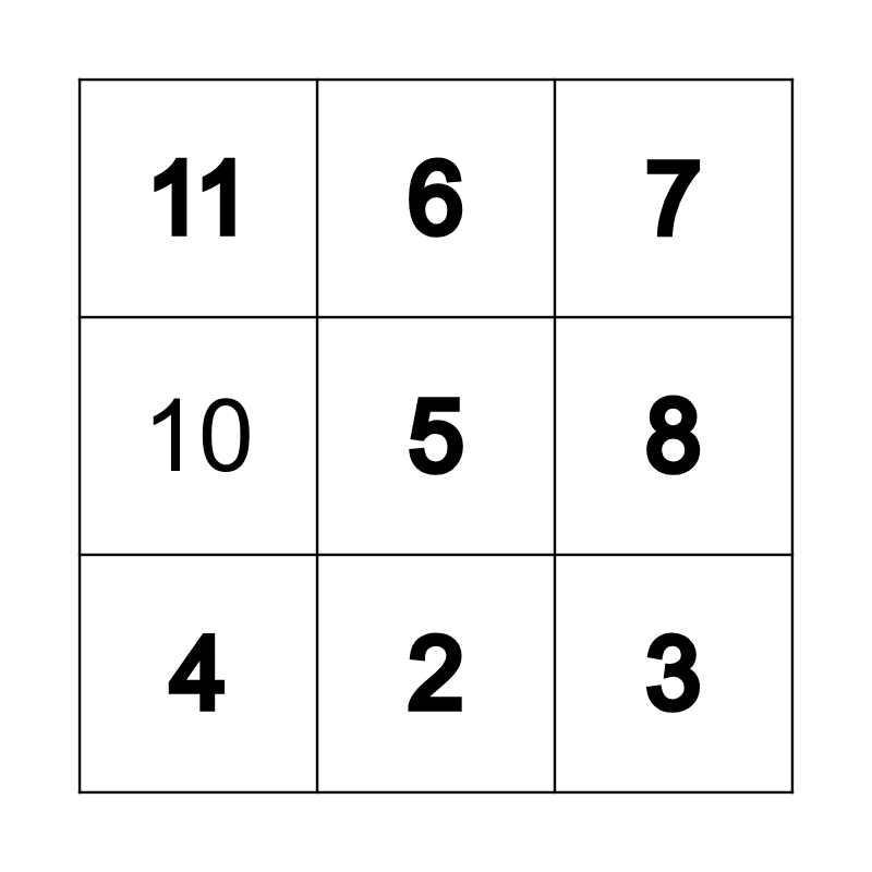 This bingo card has a free space and 11 words: 1, 2, 3, 4, 6, 7, 8, 9, 10, 11 and 12.