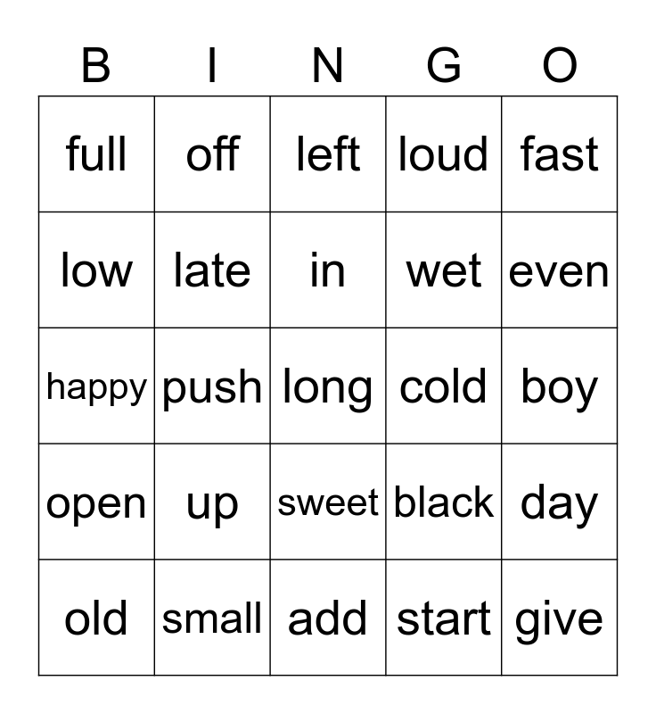 This bingo card has a free space and 24 words: up, small, in, old, fast, full, low, off, cold, sweet, wet, happy, black, day, late, start, boy, left, even, push, give, open, loud and add.