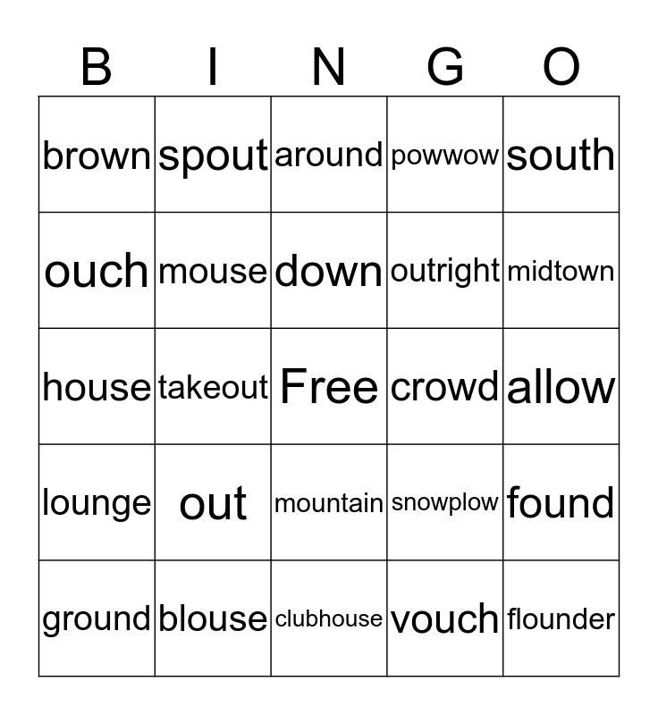 This bingo card has a free space and 24 words: out, blouse, down, ground, south, brown, ouch, spout, crowd, mountain, outright, house, snowplow, found, mouse, vouch, allow, around, midtown, takeout, flounder, lounge, powwow and clubhouse.