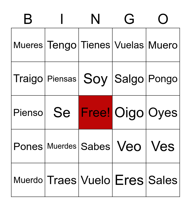 This bingo card has a free space and 24 words: Muerdo, Muerdes, Soy, Eres, Muero, Mueres, Tengo, Tienes, Oigo, Oyes, Pienso, Piensas, Veo, Ves, Traigo, Traes, Vuelo, Vuelas, Pongo, Pones, Se, Sabes, Salgo and Sales.