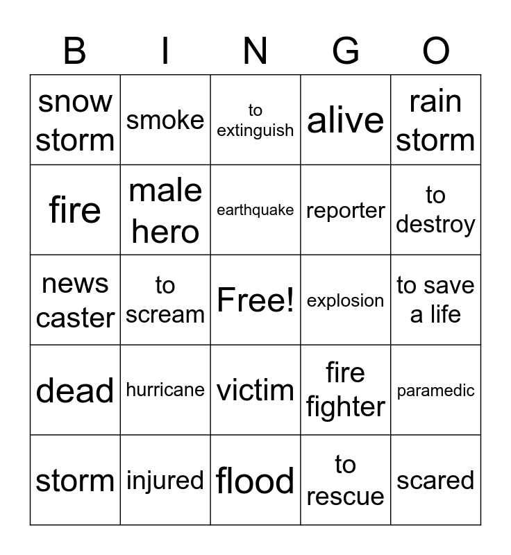 This bingo card has a free space and 25 words: hurricane, flood, earthquake, storm, rain storm, snow storm, fire, smoke, explosion, victim, reporter, news caster, fire fighter, paramedic, male hero, female hero, to save a life, to extinguish, to destroy, to scream, scared, injured, dead, alive and to rescue.