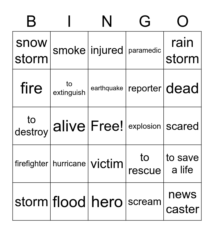 This bingo card has a free space and 24 words: hurricane, flood, earthquake, storm, rain storm, snow storm, fire, smoke, explosion, victim, reporter, to destroy, to rescue, to save a life, to extinguish, scream, scared, injured, dead, alive, news caster, firefighter, paramedic and hero.