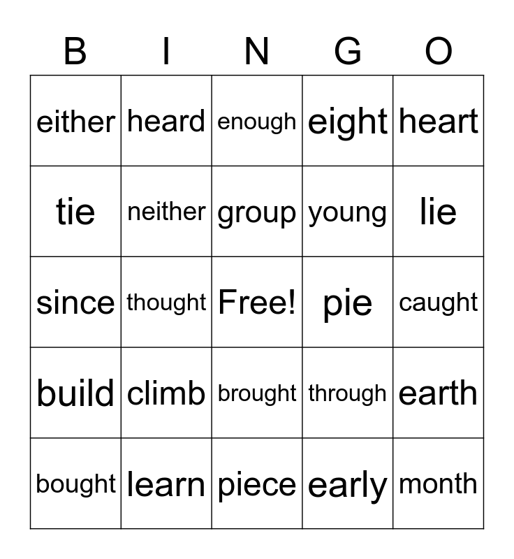 This bingo card has a free space and 24 words: climb, learn, group, bought, heart, either, tie, heard, pie, brought, young, since, through, earth, neither, early, caught, enough, lie, thought, month, build, eight and piece.