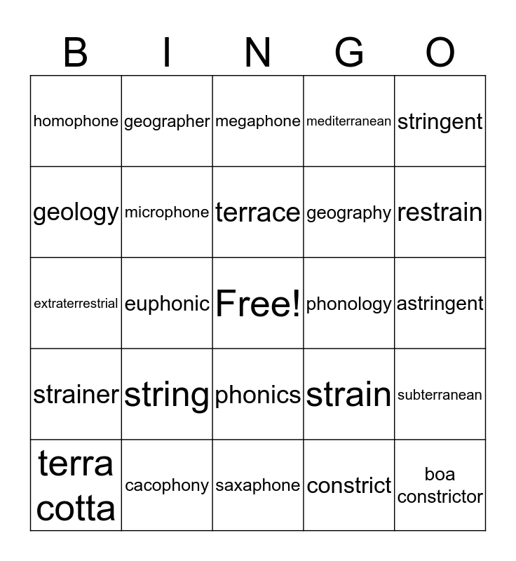 This bingo card has a free space and 30 words: cacophony, dysphonia, euphonic, gramophone, homophone, megaphone, microphone, phonics, phonology, saxaphone, astringent, boa constrictor, constrict, district, restrain, restricted, strain, strainer, string, stringent, extraterrestrial, geode, geographer, geography, geology, mediterranean, subterranean, terra cotta, terrace and territory.