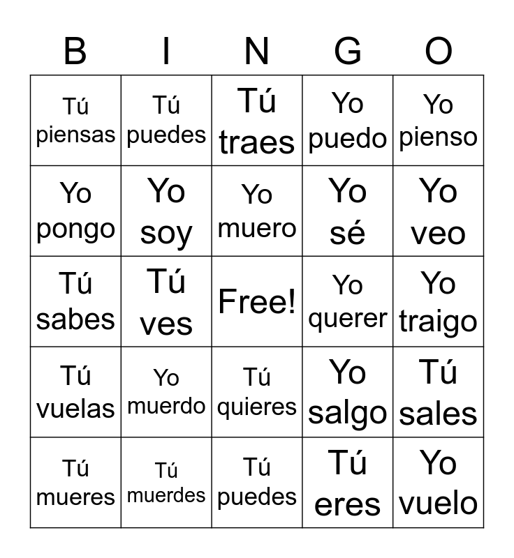 This bingo card has a free space and 24 words: Yo muerdo, Tú muerdes, Yo muero, Tú mueres, Yo pienso, Tú piensas, Yo pongo, Tú puedes, Yo querer, Tú quieres, Yo sé, Tú sabes, Yo salgo, Tú sales, Yo soy, Tú eres, Yo traigo, Tú traes, Yo veo, Tú ves, Yo vuelo, Tú vuelas, Yo puedo and Tú puedes.