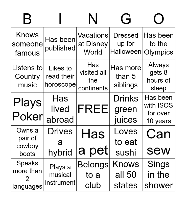 This bingo card has a free space and 24 words: Drives a hybrid, Plays a musical instrument, Has visited all the continents, Speaks more than 2 languages, Has been to the Olympics, Knows someone famous, Listens to Country music, Has been published, Drinks green juices, Has a pet, Has more than 5 siblings, Plays Poker, Loves to eat sushi, Can sew, Likes to read their horoscope, Knows all 50 states, Has been with ISOS for over 10 years, Vacations at Disney World, Always gets 8 hours of sleep, Has lived abroad, Sings in the shower, Owns a pair of cowboy boots, Dressed up for Halloween and Belongs to a club.
