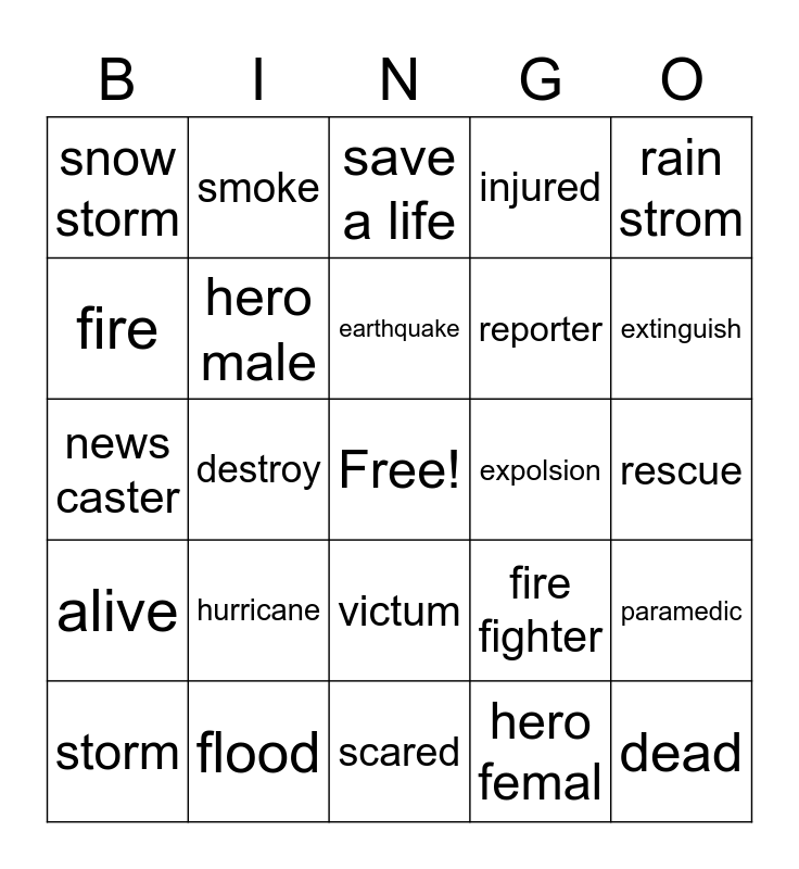 This bingo card has a free space and 24 words: hurricane, flood, earthquake, storm, rain strom, snow storm, fire, smoke, expolsion, victum, reporter, news caster, fire fighter, paramedic, hero male, hero femal, rescue, save a life, extinguish, destroy, dead, alive, injured and scared.