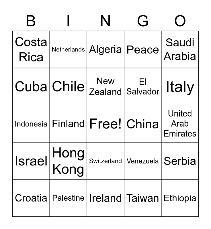 This bingo card has a free space and 85 words: Afghanistan, Albania, Algeria, Argentina, Armenia, Australia, Azerbaijan, Bangladesh, Bhutan, Brazil, Cambodia, Canada, Chile, China, Colombia, Costa Rica, Croatia, Cuba, Czechia, Denmark, Egypt, El Salvador, Ethiopia, Fiji, Finland, France, Germany, Greece, Guatemala, Honduras, Hong Kong, Hungary, India, Indonesia, Iran, Iraq, Ireland, ISB, Israel, Italy, Japan, Jordan, Kenya, Latvia, Lebanon, Malaysia, Mexico, Micronesia, Morocco, Nepal, Netherlands, New Zealand, Nigeria, North Korea, Norway, Pakistan, Palestine, Peace, Peru, Philippines, Poland, Portugal, Puerto Rico, Romania, Russia, Saudi Arabia, Scotland, Serbia, Singapore, Solomon Islands, South Africa, South Korea, Spain, Sri Lanka, Sweden, Switzerland, Taiwan, Tibet, Turkey, Ukraine, United Arab Emirates, United Kingdom, United States, Venezuela and Vietnam.