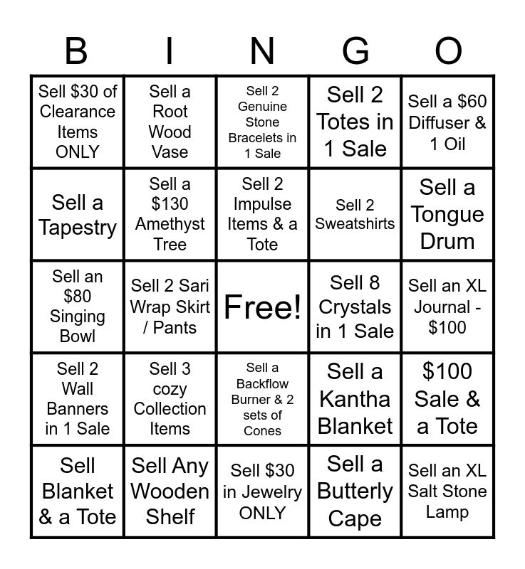 This bingo card has a free space and 24 words: Sell 3 cozy Collection Items, Sell Any Wooden Shelf, Sell 2 Impulse Items & a Tote, Sell Blanket & a Tote, Sell a $60 Diffuser & 1 Oil, Sell $30 of Clearance Items ONLY, Sell a Tapestry, Sell a Root Wood Vase, Sell 8 Crystals in 1 Sale, Sell a Backflow Burner & 2 sets of Cones, Sell 2 Sweatshirts, Sell an $80 Singing Bowl, Sell a Kantha Blanket, $100 Sale & a Tote, Sell a $130 Amethyst Tree, Sell a Butterly Cape, Sell an XL Journal - $100, Sell 2 Genuine Stone Bracelets in 1 Sale, Sell a Tongue Drum, Sell 2 Sari Wrap Skirt / Pants, Sell an XL Salt Stone Lamp, Sell 2 Wall Banners in 1 Sale, Sell 2 Totes in 1 Sale and Sell $30 in Jewelry ONLY.