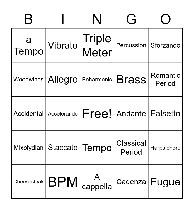 This bingo card has a free space and 31 words: A cappella, Duple Meter, Accelerando, Adagio, a Tempo, Triple Meter, Allegro, Classical Period, Andante, Cadenza, Falsetto, Fugue, Leading Tone, Legato, Romantic Period, Phrygian, Harpsichord, Staccato, Mixolydian, Tempo, Sforzando, Octave, Cheesesteak, Vibrato, Brass, Woodwinds, Percussion, Accidental, BPM, Enharmonic and Fermata.