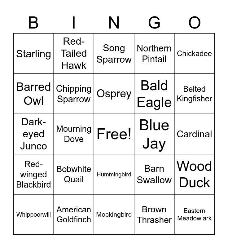 This bingo card has a free space and 30 words: American Goldfinch, Baltimore Oriole, Mourning Dove, Robin, Starling, Song Sparrow, Chipping Sparrow, Hummingbird, Blue Jay, Mockingbird, Cardinal, Eastern Meadowlark, Brown Thrasher, Cedar Waxwing, Belted Kingfisher, Housefinch, Barn Swallow, Red-winged Blackbird, Bobwhite Quail, Chickadee, Dark-eyed Junco, American Crow, Red-Tailed Hawk, Bald Eagle, Barred Owl, Northern Pintail, Wood Duck, Whippoorwill, Osprey and Turkey Vulture.