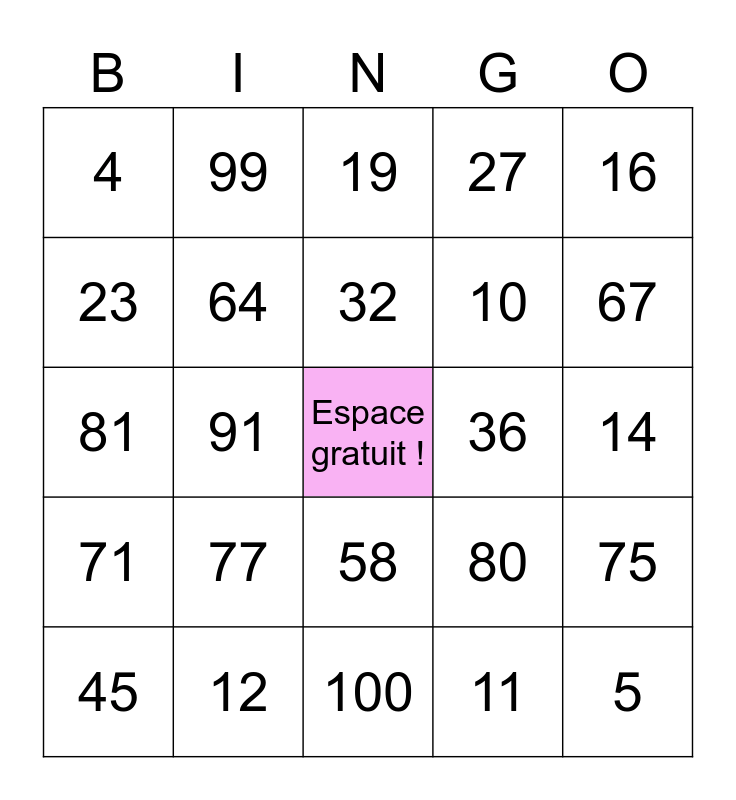 This bingo card has a free space and 24 words: 77, 12, 32, 45, 16, 4, 23, 99, 36, 58, 10, 81, 80, 75, 64, 11, 14, 19, 67, 91, 5, 71, 27 and 100.