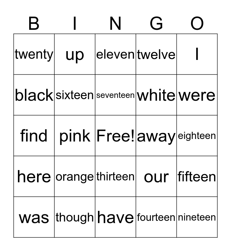 This bingo card has a free space and 24 words: orange, though, seventeen, was, I, twenty, black, up, away, thirteen, white, find, our, fifteen, sixteen, fourteen, eighteen, eleven, were, pink, nineteen, here, twelve and have.
