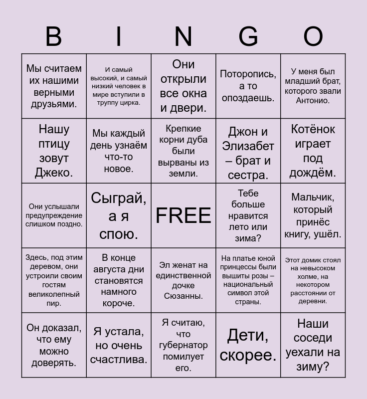 This bingo card has a free space and 24 words: В конце августа дни становятся намного короче., Я устала, но очень счастлива., Крепкие корни дуба были вырваны из земли., Он доказал, что ему можно доверять., У меня был младший брат, которого звали Антонио., Мы считаем их нашими верными друзьями., Нашу птицу зовут Джеко., И самый высокий, и самый низкий человек в мире вступили в труппу цирка., Тебе больше нравится лето или зима?, Эл женат на единственной дочке Сюзанны., Джон и Элизабет – брат и сестра., Они услышали предупреждение слишком поздно., На платье юной принцессы были вышиты розы – национальный символ этой страны., Этот домик стоял на невысоком холме, на некотором расстоянии от деревни., Мы каждый день узнаём что-то новое., Дети, скорее., Мальчик, который принёс книгу, ушёл., Они открыли все окна и двери., Котёнок играет под дождём., Сыграй, а я спою., Наши соседи уехали на зиму?, Здесь, под этим деревом, они устроили своим гостям великолепный пир., Поторопись, а то опоздаешь. and Я считаю, что губернатор помилует его..