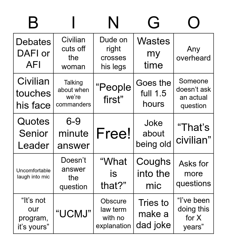 This bingo card has a free space and 24 words: Doesn’t answer the question, “UCMJ”, “People first”, “It’s not our program, it’s yours”, Any overheard, Debates DAFI or AFI, Civilian touches his face, Civilian cuts off the woman, Joke about being old, “What is that?”, Goes the full 1.5 hours, Quotes Senior Leader, Coughs into the mic, Asks for more questions, Talking about when we’re commanders, Tries to make a dad joke, “That’s civilian”, Dude on right crosses his legs, Someone doesn’t ask an actual question, 6-9 minute answer, “I’ve been doing this for X years”, Uncomfortable laugh into mic, Wastes my time and Obscure law term with no explanation.