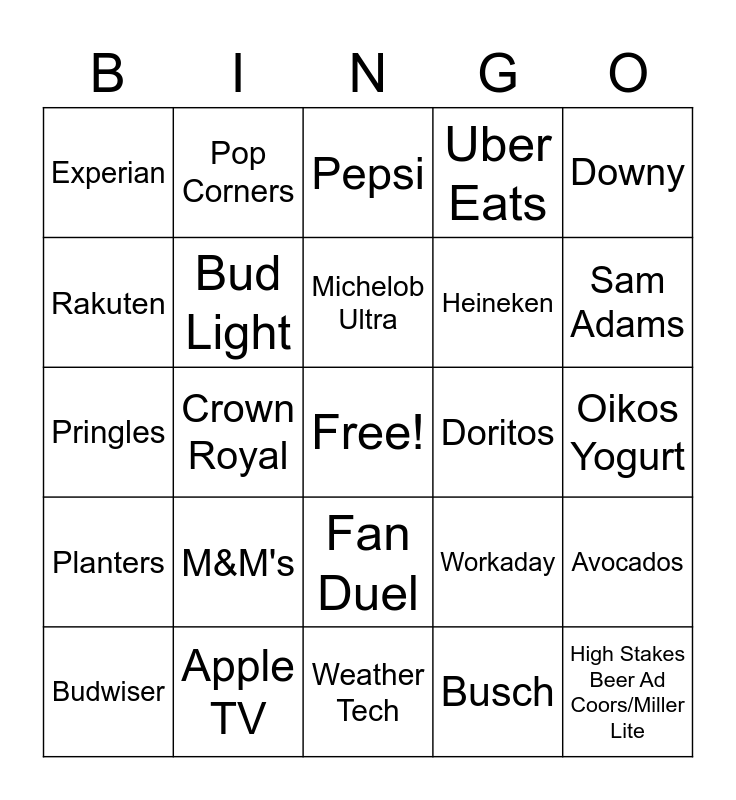 This bingo card has a free space and 24 words: M&M's, Apple TV, Michelob Ultra, Budwiser, Downy, Experian, Rakuten, Pop Corners, Doritos, Fan Duel, Heineken, Pringles, Workaday, Avocados, Bud Light, Busch, Oikos Yogurt, Pepsi, Sam Adams, Crown Royal, High Stakes Beer Ad Coors/Miller Lite, Planters, Uber Eats and Weather Tech.