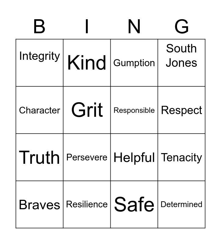 This bingo card has 16 words: Resilience, Tenacity, Gumption, Integrity, Truth, Kind, Helpful, Safe, Character, Grit, Braves, South Jones, Persevere, Respect, Responsible and Determined.