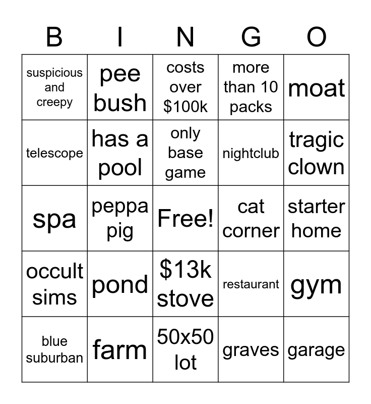 This bingo card has a free space and 24 words: pond, farm, only base game, blue suburban, moat, suspicious and creepy, telescope, pee bush, cat corner, $13k stove, nightclub, spa, restaurant, gym, has a pool, graves, starter home, costs over $100k, tragic clown, peppa pig, garage, occult sims, more than 10 packs and 50x50 lot.