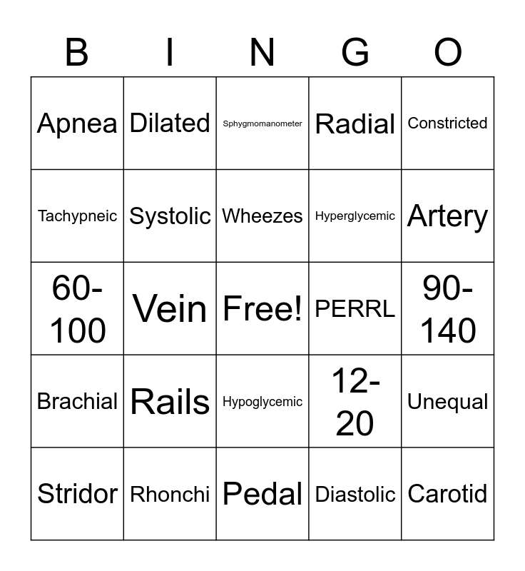 This bingo card has a free space and 24 words: Rails, Rhonchi, Wheezes, Stridor, Constricted, Apnea, Tachypneic, Dilated, PERRL, Hypoglycemic, Hyperglycemic, 60-100, 12-20, Unequal, Systolic, Diastolic, 90-140, Sphygmomanometer, Artery, Vein, Carotid, Brachial, Radial and Pedal.
