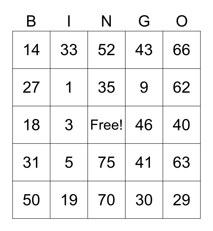 This bingo card has a free space and 24 words: 5, 19, 35, 50, 66, 14, 27, 33, 46, 75, 9, 18, 41, 63, 1, 30, 40, 52, 62, 3, 29, 31, 43 and 70.