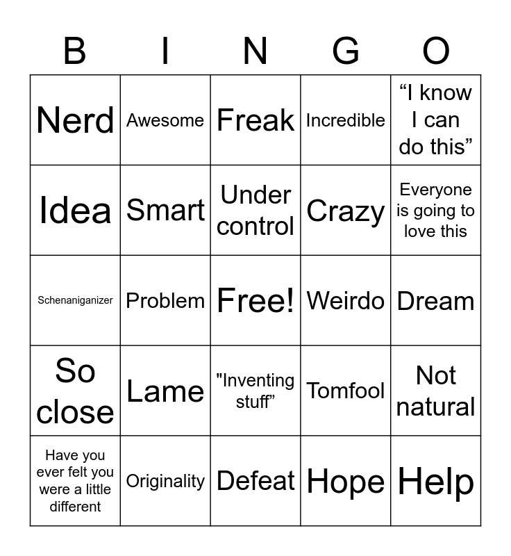 This bingo card has a free space and 29 words: Have you ever felt you were a little different, Unique, Problem, Invented, Nerd, Freak, Smart, Lame, Weirdo, Originality, Dream, Help, Defeat, Hope, Everyone is going to love this, Disaster, "Inventing stuff”, So close, “I know I can do this”, Schenaniganizer, Tomfool, Ruin, Crazy, Idea, Incredible, Awesome, Not natural, Under control and Alone.