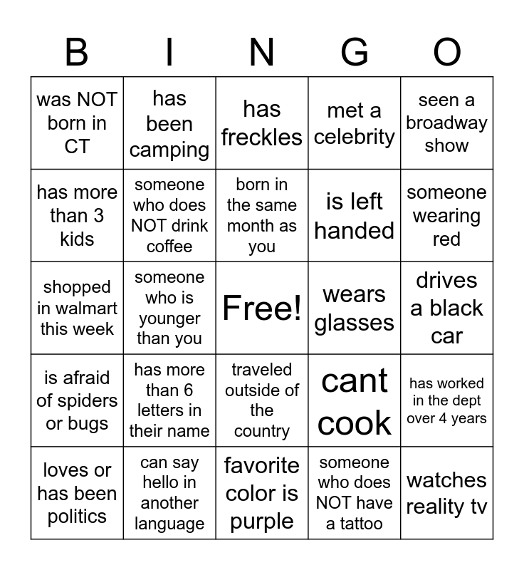 This bingo card has a free space and 24 words: has more than 6 letters in their name, can say hello in another language, born in the same month as you, loves or has been politics, seen a broadway show, was NOT born in CT, has more than 3 kids, has been camping, wears glasses, traveled outside of the country, is left handed, shopped in walmart this week, cant cook, has worked in the dept over 4 years, someone who does NOT drink coffee, someone who does NOT have a tattoo, drives a black car, has freckles, someone wearing red, someone who is younger than you, watches reality tv, is afraid of spiders or bugs, met a celebrity and favorite color is purple.
