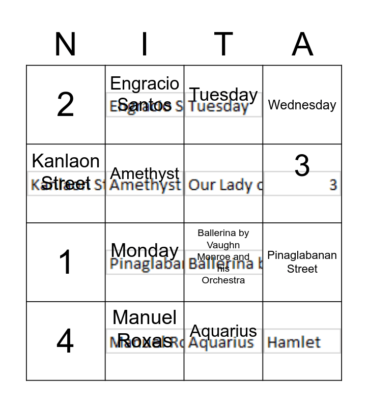 This bingo card has 11 images and 14 words: Manuel Roxas, Pinaglabanan Street, Tuesday, 2, 1, Engracio Santos, Ballerina by Vaughn Monroe and his Orchestra, Aquarius, Kanlaon Street, Amethyst, 4, Wednesday, Monday and 3.