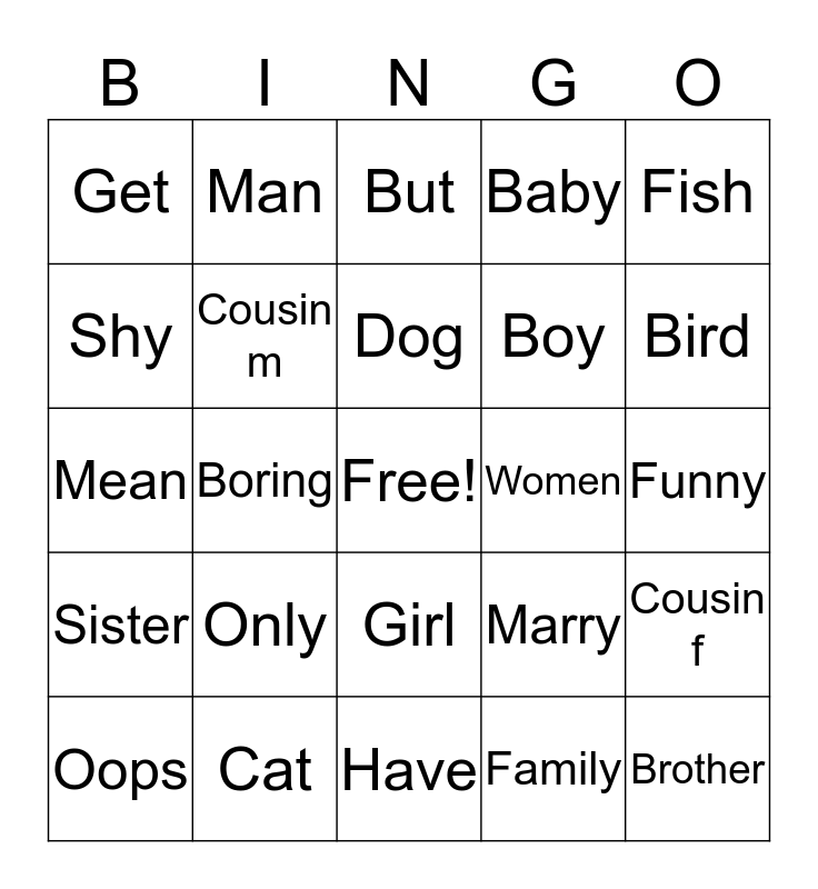 This bingo card has a free space and 24 words: Only, Cat, Dog, Oops, Fish, Get, Shy, Man, Women, Girl, Boy, Mean, Marry, Cousin f, Cousin m, Family, Funny, But, Bird, Boring, Brother, Sister, Baby and Have.