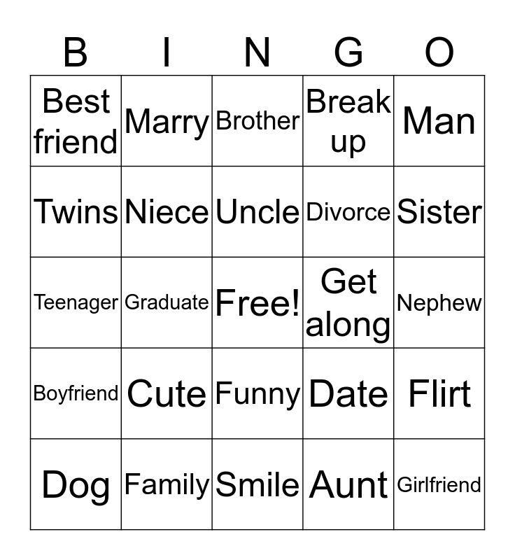 This bingo card has a free space and 24 words: Cute, Family, Uncle, Dog, Man, Best friend, Twins, Marry, Get along, Funny, Divorce, Teenager, Date, Flirt, Niece, Aunt, Nephew, Brother, Sister, Graduate, Girlfriend, Boyfriend, Break up and Smile.