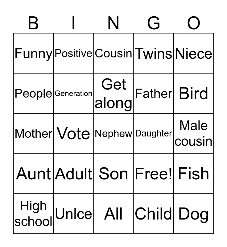 This bingo card has 25 words: Adult, All, Get along, High school, Niece, Funny, People, Positive, Daughter, Son, Father, Mother, Free!, Fish, Generation, Dog, Male cousin, Cousin, Bird, Vote, Nephew, Unlce, Aunt, Twins and Child.