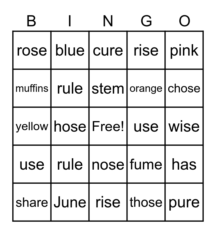 This bingo card has a free space and 30 words: June, these, hose, rude, rose, cure, rule, nose, use, rise, wise, pure, those, cute, chose, dude, fume, use, rule, pink, yellow, green, blue, orange, muffins, rise, has, share, stem and plants.