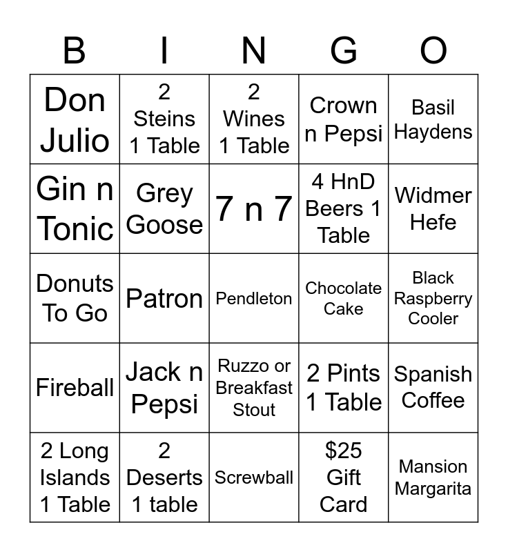 This bingo card has 35 words: No Waters, 2 Drops 1 Table, Appetizer and Desert on same Table, 4 HnD Beers 1 Table, Mansion Margarita, Don Julio, Grey Goose, Blackberry Lemonade, Chocolate Cake, Growler, Donuts To Go, 2 Steins 1 Table, Ruzzo or Breakfast Stout, 2 Margs 1 Table, Basil Haydens, Fireball, 2 Deserts 1 table, 2 Wines 1 Table, $25 Gift Card, Black Raspberry Cooler, 2 Long Islands 1 Table, Patron, Pendleton, Basil Haydens, Widmer Hefe, Gin n Tonic, Gin n Juice, Screwball, 2 Pints 1 Table, Spanish Coffee, Adult Hot Cocoa, Jack n Pepsi, 7 n 7, Crown n Pepsi and Makers Mark.