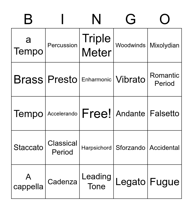 This bingo card has a free space and 29 words: A cappella, Duple Meter, Accelerando, Adagio, a Tempo, Triple Meter, Presto, Classical Period, Andante, Cadenza, Falsetto, Fugue, Leading Tone, Legato, Romantic Period, Phrygian, Harpsichord, Staccato, Mixolydian, Tempo, Sforzando, Cheesesteak, Vibrato, Brass, Woodwinds, Percussion, Accidental, Enharmonic and Fermata.