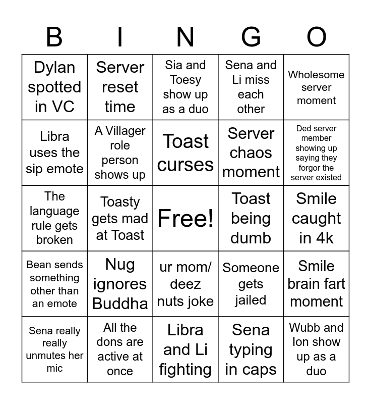 This bingo card has a free space and 24 words: Nug ignores Buddha, All the dons are active at once, Toast curses, Sena really really unmutes her mic, Wholesome server moment, Dylan spotted in VC, Libra uses the sip emote, Server reset time, Toast being dumb, ur mom/ deez nuts joke, Server chaos moment, The language rule gets broken, Someone gets jailed, Smile brain fart moment, A Villager role person shows up, Sena typing in caps, Smile caught in 4k, Sia and Toesy show up as a duo, Ded server member showing up saying they forgor the server existed, Toasty gets mad at Toast, Wubb and Ion show up as a duo, Bean sends something other than an emote, Sena and Li miss each other and Libra and Li fighting.
