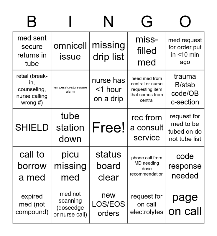 This bingo card has a free space and 38 words: compatibility question, TPN issue, stat alteplase, temperature/pressure alarm, code response needed, picu missing med, nurse has <1 hour on a drip, move meds between omnicell, med request for order put in <10 min ago, need med from central or nurse requesting item that comes from central, tube station down, miss-filled med, page on call, request for med to be tubed on do not tube list, retail (break-in, counseling, nurse calling wrong #), call to borrow a med, med message requesting drug in omnicell, missing drip list, smog compound, rec from a consult service, med sent secure returns in tube, med not scanning (doseedge or nurse call), trauma B/stab code/OB c-section, expired med (not compound), doseedge bypass, new LOS/EOS orders, call from outside pharm to borrow med, tube shut down for full tube, request for vaccine, recon med, ID home med, status board clear, request for on call electrolytes, omnicell issue, med message requesting med scanned into med bin, phone call from MD needing dose recommendation, SHIELD and need to waste for narc.