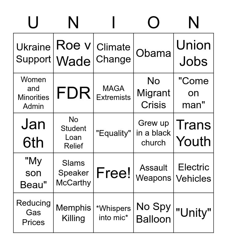This bingo card has 26 words: Free!, No Spy Balloon, MAGA Extremists, Memphis Killing, Union Jobs, Ukraine Support, Women and Minorities Admin, Roe v Wade, Trans Youth, Assault Weapons, No Migrant Crisis, Jan 6th, Electric Vehicles, Reducing Gas Prices, No Student Loan Relief, Price of Eggs, Obama, "My son Beau", Climate Change, "Equality", "Come on man", *Whispers into mic*, Grew up in a black church, Slams Speaker McCarthy, FDR and "Unity".