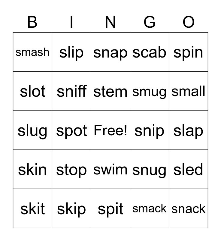 This bingo card has a free space and 24 words: stop, skip, stem, skit, spin, smash, slot, slip, snip, swim, smug, slug, snug, sled, sniff, smack, slap, snap, small, spot, snack, skin, scab and spit.