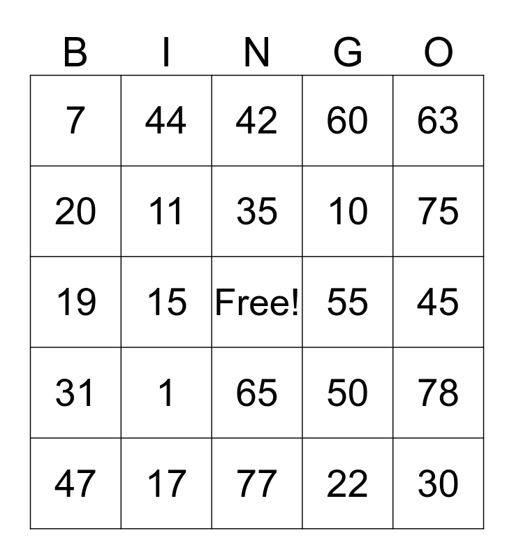 This bingo card has a free space and 24 words: 1, 17, 35, 47, 63, 7, 20, 44, 55, 65, 10, 19, 50, 78, 11, 22, 45, 42, 75, 15, 30, 31, 60 and 77.