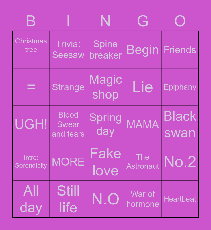 This bingo card has a free space and 24 words: MORE, Still life, Magic shop, All day, Friends, Christmas tree, =, Trivia: Seesaw, MAMA, Fake love, Lie, UGH!, The Astronaut, No.2, Strange, War of hormone, Black swan, Spine breaker, Epiphany, Blood Swear and tears, Heartbeat, Intro: Serendipity, Begin and N.O.