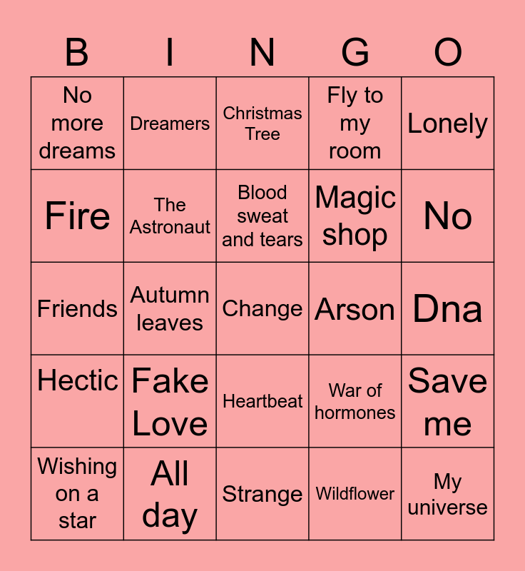 This bingo card has 25 words: Hectic, All day, Change, Wildflower, Lonely, No more dreams, Dreamers, Christmas Tree, Arson, Save me, Fire, The Astronaut, Strange, War of hormones, No, Wishing on a star, Autumn leaves, Blood sweat and tears, Magic shop, Dna, Friends, Fake Love, Heartbeat, Fly to my room and My universe.