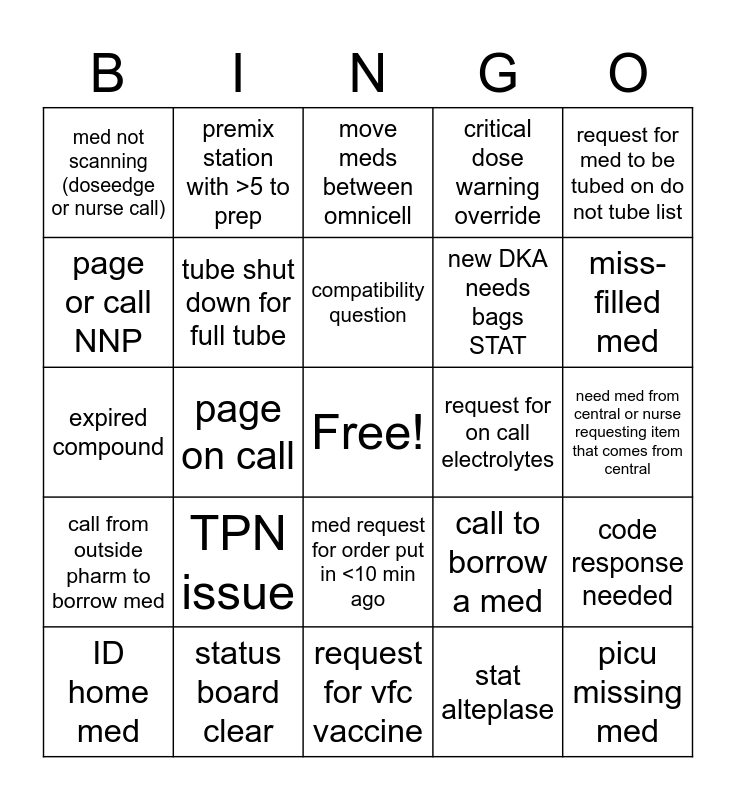 This bingo card has a free space and 42 words: weird/inappropriate item in return bin, compatibility question, can I crush/does this go in a gtube, TPN issue, stat alteplase, code response needed, picu missing med, nurse has <1 hour on a drip, move meds between omnicell, med request for order put in <10 min ago, need med from central or nurse requesting item that comes from central, miss-filled med, page on call, request for med to be tubed on do not tube list, retail (break-in, counseling, nurse calling wrong #), call to borrow a med, med message requesting drug in omnicell, expired compound, smog compound, premix station with >5 to prep, page or call NNP, rec from a consult service, med sent secure returns in tube, med not scanning (doseedge or nurse call), trauma B/stab code/OB c-section, expired med (not compound), new DKA needs bags STAT, pharm-is ticket, doseedge bypass, brand new TPN, new LOS/EOS orders, call from outside pharm to borrow med, tube shut down for full tube, request for vfc vaccine, recon antibiotic, ID home med, status board clear, request for on call electrolytes, med message requesting med scanned into med bin, phone call from MD needing dose recommendation, critical dose warning override and need to waste for a narc.