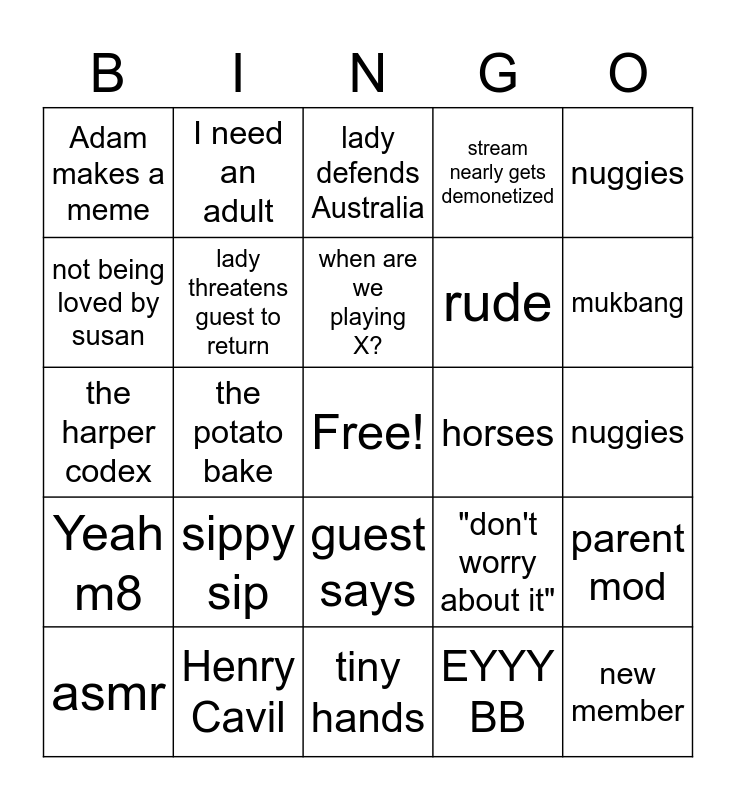 This bingo card has a free space and 24 words: sippy sip, Henry Cavil, when are we playing X?, asmr, nuggies, Adam makes a meme, not being loved by susan, I need an adult, horses, guest says, rude, the harper codex, "don't worry about it", parent mod, lady threatens guest to return, EYYY BB, nuggies, lady defends Australia, mukbang, the potato bake, new member, Yeah m8, stream nearly gets demonetized and tiny hands.