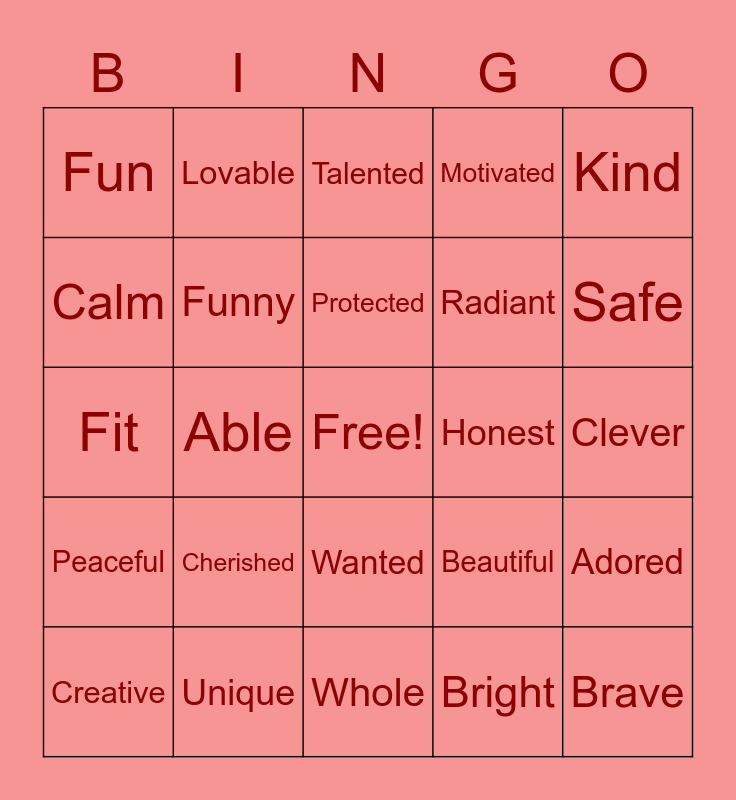 This bingo card has a free space and 24 words: Cherished, Unique, Protected, Creative, Kind, Fun, Calm, Lovable, Honest, Wanted, Radiant, Fit, Beautiful, Adored, Funny, Bright, Clever, Talented, Safe, Able, Brave, Peaceful, Motivated and Whole.