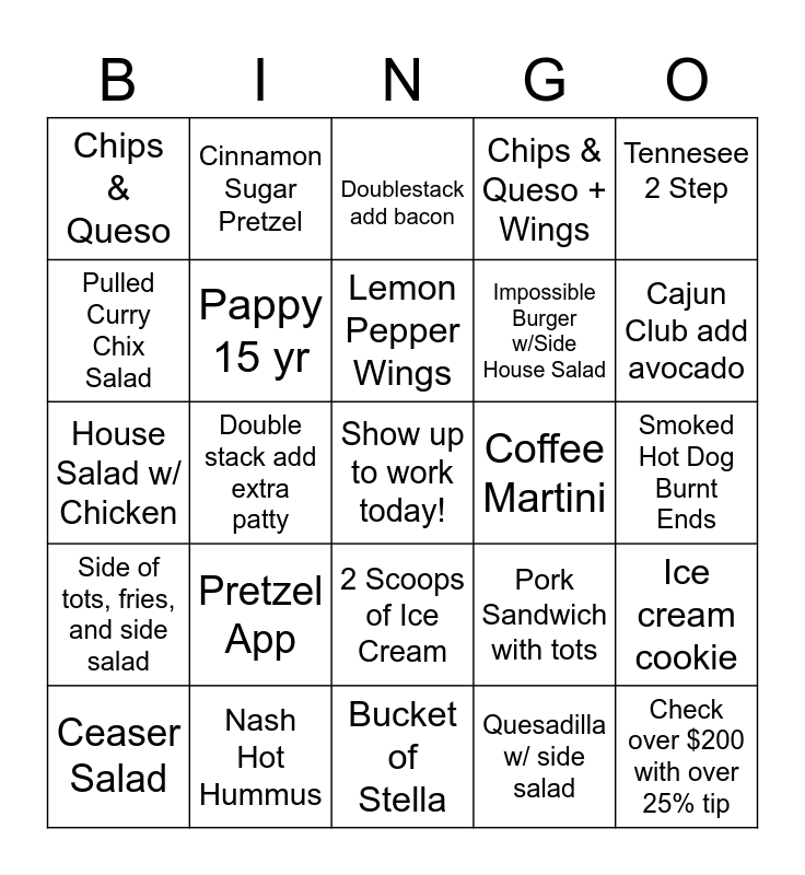This bingo card has a free space and 24 words: Pretzel App, Nash Hot Hummus, Lemon Pepper Wings, Ceaser Salad, Tennesee 2 Step, Chips & Queso, Pulled Curry Chix Salad, Cinnamon Sugar Pretzel, Coffee Martini, 2 Scoops of Ice Cream, Impossible Burger w/Side House Salad, House Salad w/ Chicken, Pork Sandwich with tots, Ice cream cookie, Pappy 15 yr, Quesadilla w/ side salad, Smoked Hot Dog Burnt Ends, Doublestack add bacon, Cajun Club add avocado, Double stack add extra patty, Check over $200 with over 25% tip, Side of tots, fries, and side salad, Chips & Queso + Wings and Bucket of Stella.